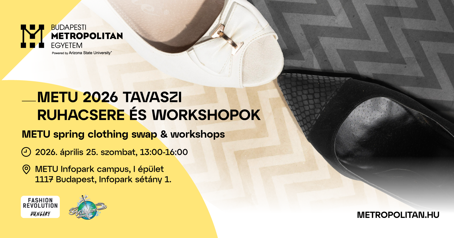 A Budapesti Metropolitan Egyetem Művészet- és Designelméleti Intézete a Fashion Revolution Hét keretében Tavaszi Ruhacsere és Workshopok címmel szervez közösségi eseményt 2026. április 25-én a METU Infopark Campusán. A program központi témája az átalakulás: annak vizsgálata, hogyan formálják ruháink identitásunkat, érzéseinket és mindennapjainkat, és miként válhat egy ruhadarab új történetek és jelentések hordozójává egy másik ember életében.