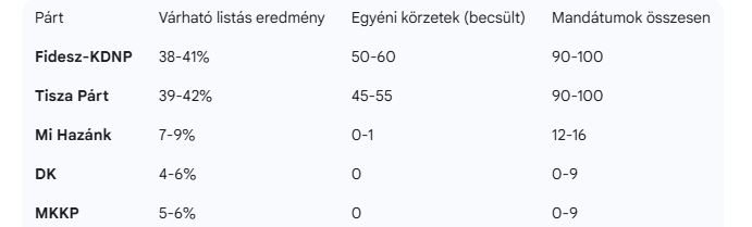 A mérések (pl. Medián, 21 Kutatóközpont, Publicus) alapján a verseny rendkívül szoros. A Tisza Párt és a Fidesz-KDNP fej-fej mellett halad a népszerűségi listák élén. Jelenleg nem lehet biztos győztest hirdetni: a mandátumbecslések azt mutatják, hogy bármelyik oldal győz, valószínűleg nem lesz meg a kétharmados többség, sőt, egy törékeny többségű kormányzás vagy koalíciós kényszer képe körvonalazódik.